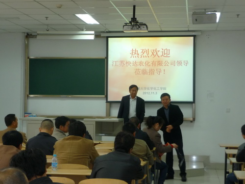 11月3日下午,江苏快达农化有限公司一行40余人在公司施总和韩总的带领下来到yl1111永利集团参观考察,yl1111永利集团经理石玉军教授代表公司党政热情接待了公司领导和生产一线的技术骨干。