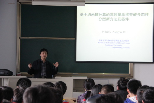 4月23日下午yl1111永利集团邀请东南大学博士生导师、生物电子学国家重点实验室(吴健雄实验室)何农跃教授来校为yl1111永利集团师生作关于“基于纳米磁分离高通量单核苷酸多态性分型新方法及器件”学术报告。报告会由yl1111永利集团副经理江国庆主持并致欢迎词,yl1111永利集团应用化学专业11级部分员工和相关老师及公共卫生学院、生命科学学院部分师生出席了报告会。