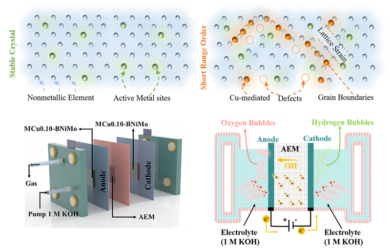 氢能被认为是一种极具潜力的零碳清洁能源,然而传统的电催化剂很难实现大电流密度下高效产氢,高纯度绿氢的高效制备严重制约了氢能的应用发展。因此,开发一种能在大电流密度下稳定运行的电催化剂成为亟需解决的关键问题。本研究通过Cu介导NiMo双金属氧化物成功诱导了其晶界的演变,通过密度泛函理论计算表明,晶界的形成改变了Mo位点的配位环境,优化了H*吸附能,改善了电荷转移,从而实现了工业级电流密度下高效产氢。其中,最佳MCu0.10-BNiMo电极在极低过电位下即可达到超高电流密度。在工业电解槽测试中,最高电流密度可达到商业贵金属催化剂Pt/C的五倍。这项研究为设计用于工业化产氢的电催化剂提供了一种新的解决方案,极大地推动了绿氢的规模化生产和“氢经济”蓝图的早日实现。