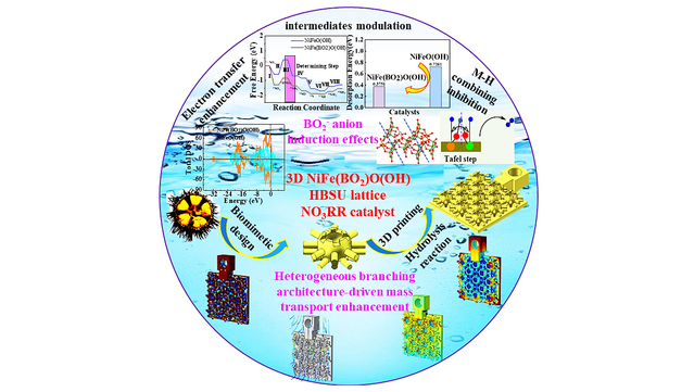 该研究成功构建了一种基于BO2-阴离子诱导效应和异质分支结构驱动的质量传输增强策略设计的高效硝酸盐还原制氨催化剂。通过3D打印技术制备的空心仿生海胆结构,不仅自驱动产生差异化的微对流区,显著改善了催化过程中的质量传输动力学,同时协同BO2-诱导效应提高了催化剂的整体性能。该催化剂在高电流密度下表现出优异的氨产率和法拉第效率,并具有良好的长期稳定性。此研究为设计高性能NO3RR催化剂提供了新的思路。