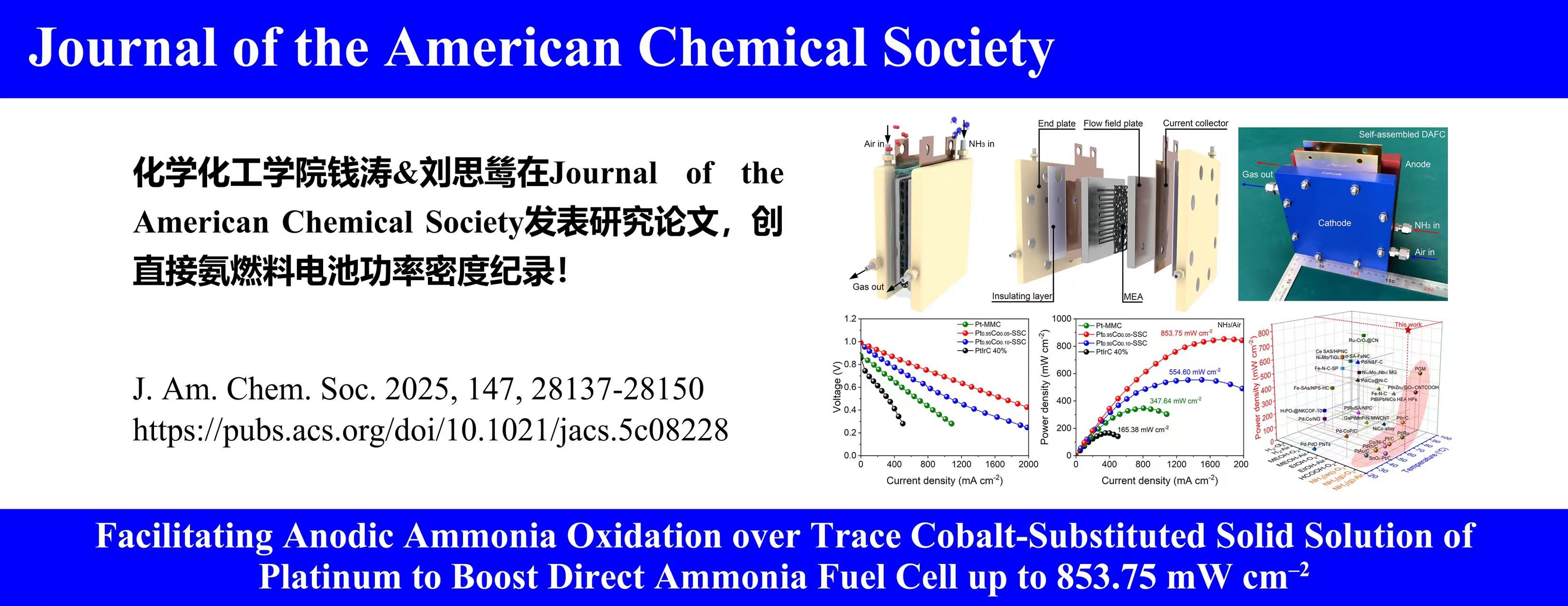 Y. He, S. Liu, Q. Cheng, Y. Huan, L. Zhang, W. Shi, W. Shen, F. Zhou, X. Yuan, M. Wang, C. Yan, T. Qian, Facilitating Anodic Ammonia Oxidation over Trace Cobalt-Substituted Solid Solution of Platinum to Boost Direct Ammonia Fuel Cell up to 853.75 mW cm–2, J. Am. Chem. Soc. 2025, 147, 28137-28150.