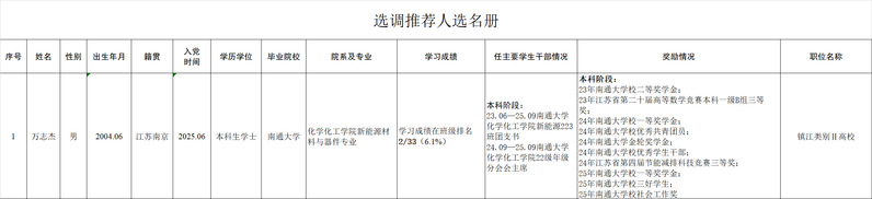 根据《江苏省2026年应届优秀大学毕业生选调工作公告》及学校相关工作要求,经个人申报、资格审查、综合考察、学院推荐等程序,拟推荐万志杰1名本科生为江苏省2026年应届优秀大学毕业生选调初步推荐人选。现将推荐人基本情况及排序进行公示。